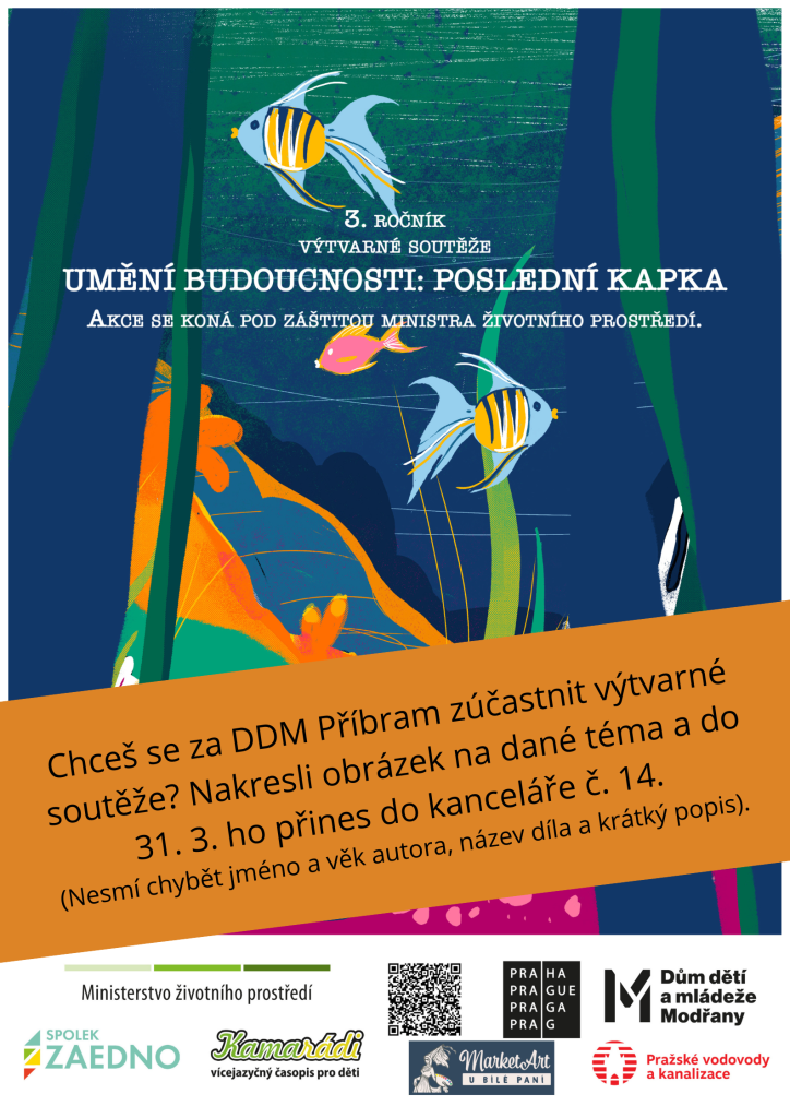 Dům dětí a mládeže Modřany pořádá 3. ročník výtvarné soutěže na téma Umění budoucnosti: Poslední kapka. Akce se koná pod záštitou Ministra životního prostředí.