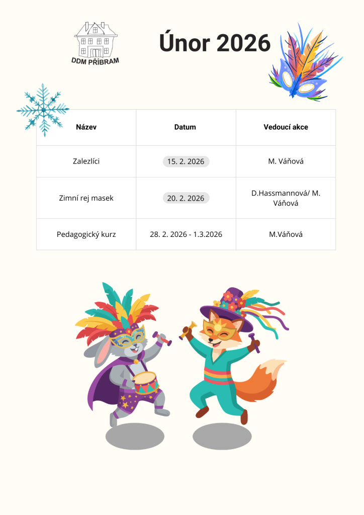 Únor u nás bude plný zážitků! Těšit se můžete na divadelní představení loutkoherecké skupiny Zalezlíci, veselý zimní rej masek pro děti i další společné chvíle plné radosti. Současně proběhne také pedagogický kurz, kterým dále rozvíjíme kvalitu našich aktivit pro děti a mládež.