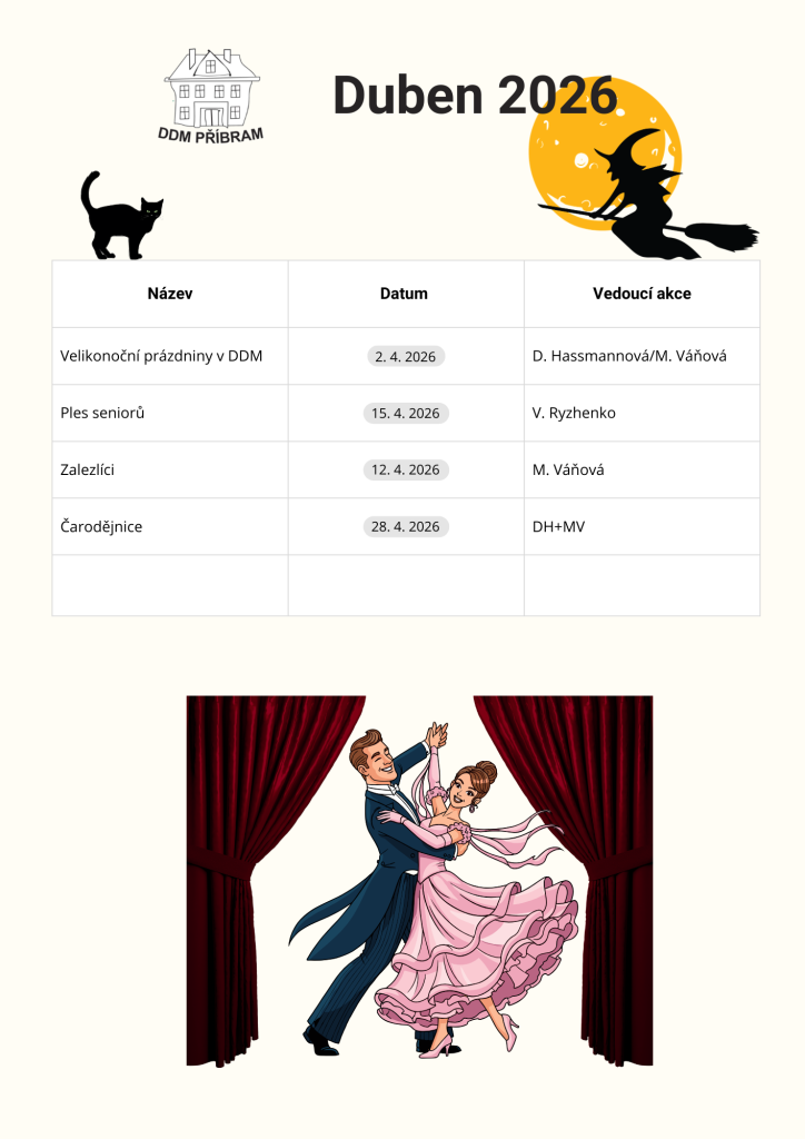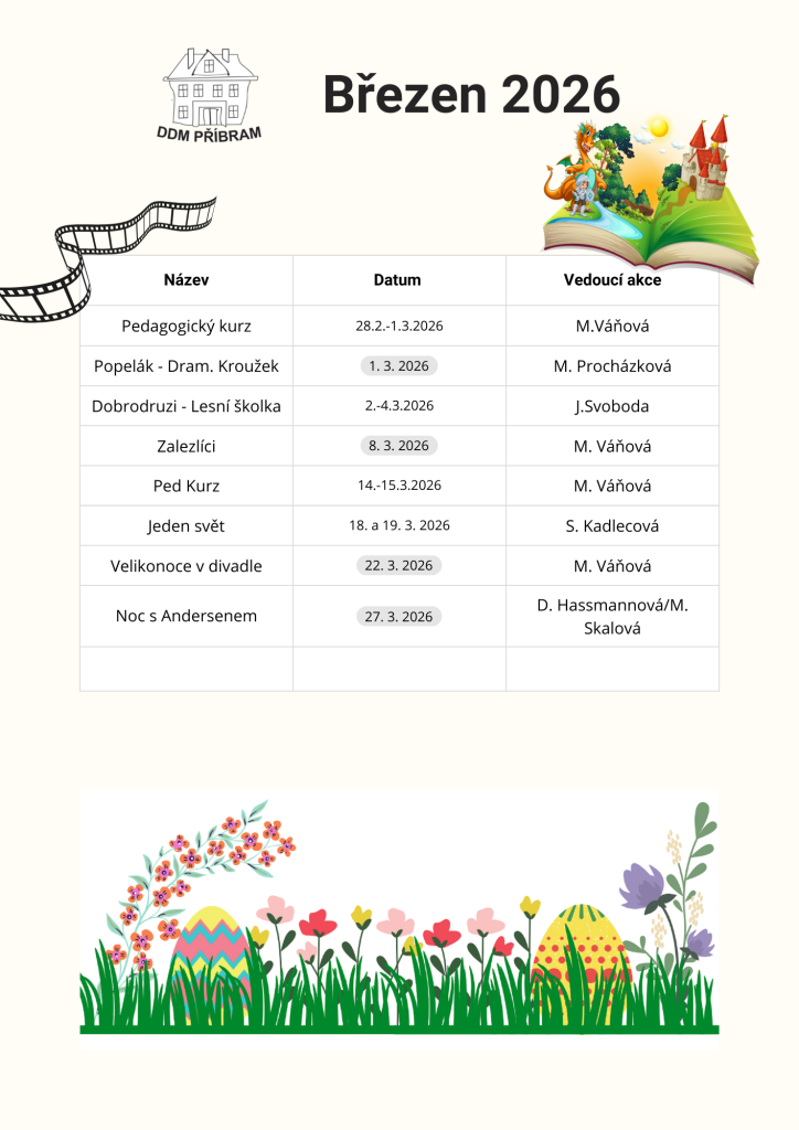 Na březen a duben jsme pro děti připravili pestrý program plný zážitků, tvoření i společného setkávání. Těšit se mohou na vystoupení divadla Zalezlíci, oblíbenou Noc s Andersenem, Velikonoční prázdniny v DDM i v divadle a také na tradiční Čarodějnice. Děti z kroužku Zumby a Tanečního světa vystoupí na Plese seniorů.